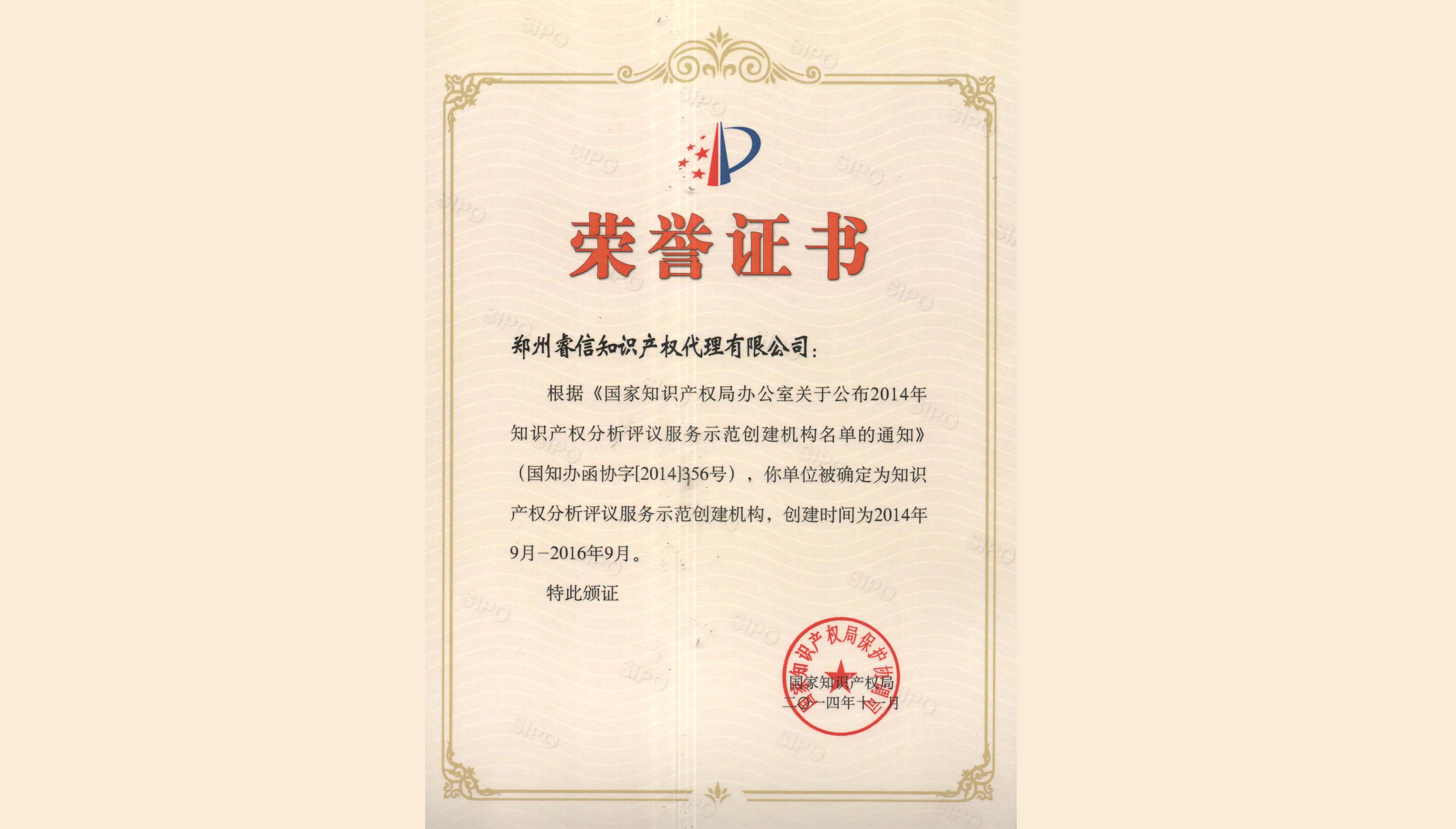 2014年11月公司被國家知識(shí)產(chǎn)權(quán)局確定為“知識(shí)產(chǎn)權(quán)分析評(píng)議服務(wù)示范創(chuàng)建機(jī)構(gòu)”。