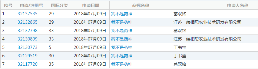 在生活中存在這樣一種“怪”現(xiàn)象:當(dāng)一部電影或者電視劇大火的時候,當(dāng)出現(xiàn)新的社會熱點的時候,總會刮起一陣商標(biāo)搶注的狂潮。電視劇如“花千骨”、“羋月傳”等,流行詞匯如“洪荒之力”、“老鐵”、“藍(lán)瘦香菇”等,當(dāng)它們進(jìn)入公眾視野的之時往往就有人將其搶注為商標(biāo)。在“藥神”如此火爆的情況下,搶注人自然不會放過這個熱點,除了蜂擁而上搶注“我不是藥神”的電影名,連電影中出現(xiàn)的抗癌藥“格列寧”也沒能逃過“毒手”。以下是近期被搶注商標(biāo)列表: