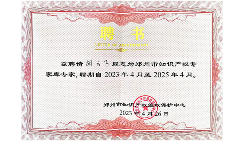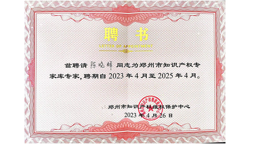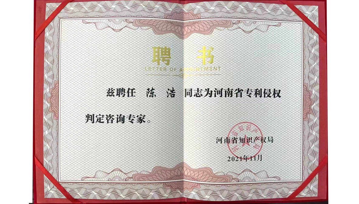 2021年11月公司總經(jīng)理陳浩被河南省知識產(chǎn)權(quán)局聘為河南省專利侵權(quán)判定咨詢專家。