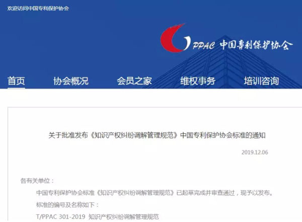中國(guó)專(zhuān)利保護(hù)協(xié)會(huì)標(biāo)準(zhǔn)《知識(shí)產(chǎn)權(quán)糾紛調(diào)解管理規(guī)范》已起草完成并審查通過(guò),現(xiàn)予以發(fā)布。