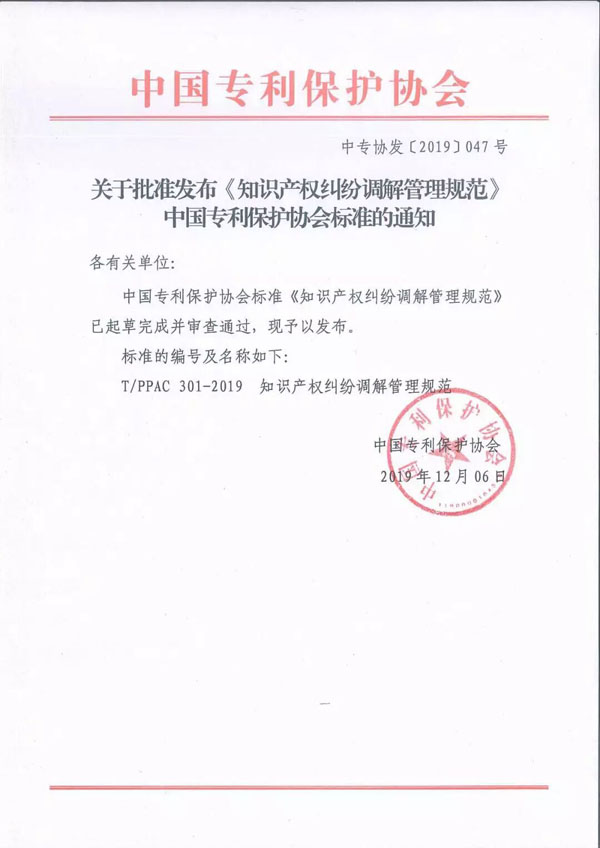 關(guān)于批準(zhǔn)發(fā)布《知識(shí)產(chǎn)權(quán)糾紛調(diào)解管理規(guī)范》中國(guó)專(zhuān)利保護(hù)協(xié)會(huì)標(biāo)準(zhǔn)的通知